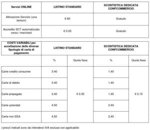 (*) Comprende fino ad un massimo del 5% mensile di transato con Carte Commercial. Al transato con Carte Commercial eccedente il 5%, verranno applicate le maggiorazioni previste dai tariffari in vigore al momento della sottoscrizione del Contratto di Servizio.